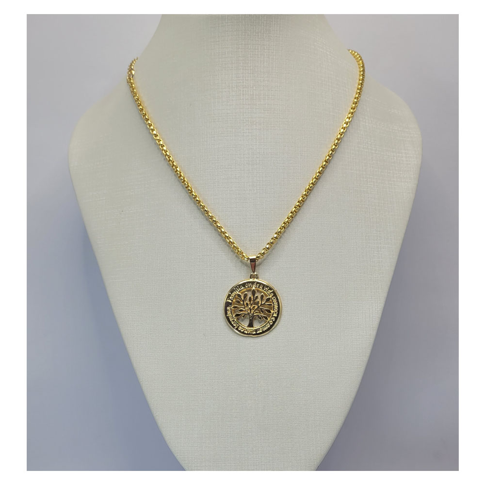 Pingente: Medalha redonda com o delicado desenho de uma árvore da vida, acompanhada de detalhes decorativos ao redor.
