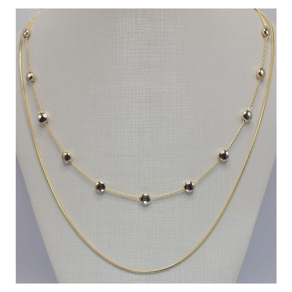 Este colar duplo em tom dourado é um verdadeiro destaque para compor visuais sofisticados. Com uma combinação harmoniosa de duas correntes, uma com esferas delicadas e outra lisa, este acessório proporciona elegância e versatilidade em um único design.
