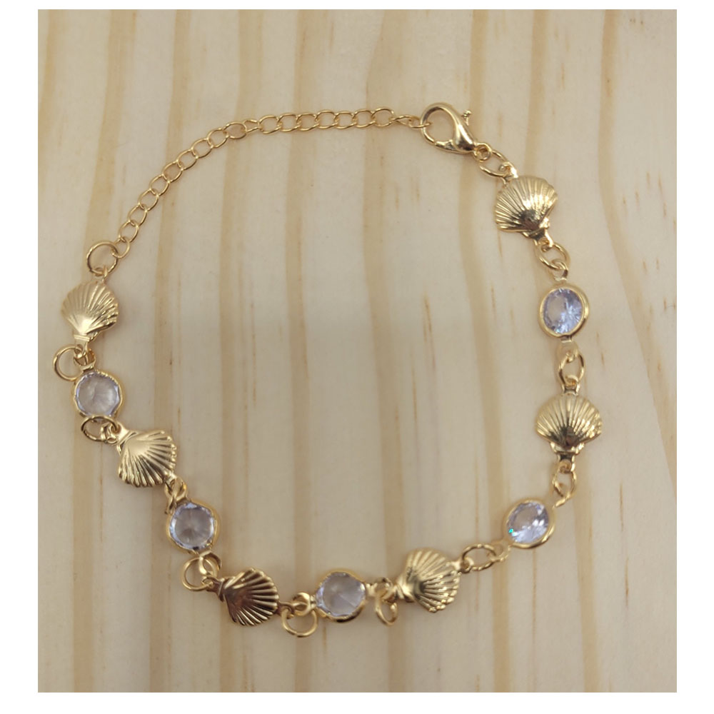 Pulseira dourada com detalhes de conchas e cristais translúcidos, ideal para compor looks leves e elegantes. Características do Produto: Material: Liga metálica Banhada a Ouro 18k com acabamento polido. Cristais translúcidos que realçam o brilho e a sofisticação da peça. Design: Detalhes delicados em formato de conchas intercalados com cristais. Fecho ajustável com corrente extensora. Tamanho: Comprimento total: 17 cm + 5 cm de corrente ajustável. Destaques: Inspirada no estilo praiano com um toque sofisticado. Combina perfeitamente com outras peças ou pode ser usada sozinha como destaque. Cuidados: