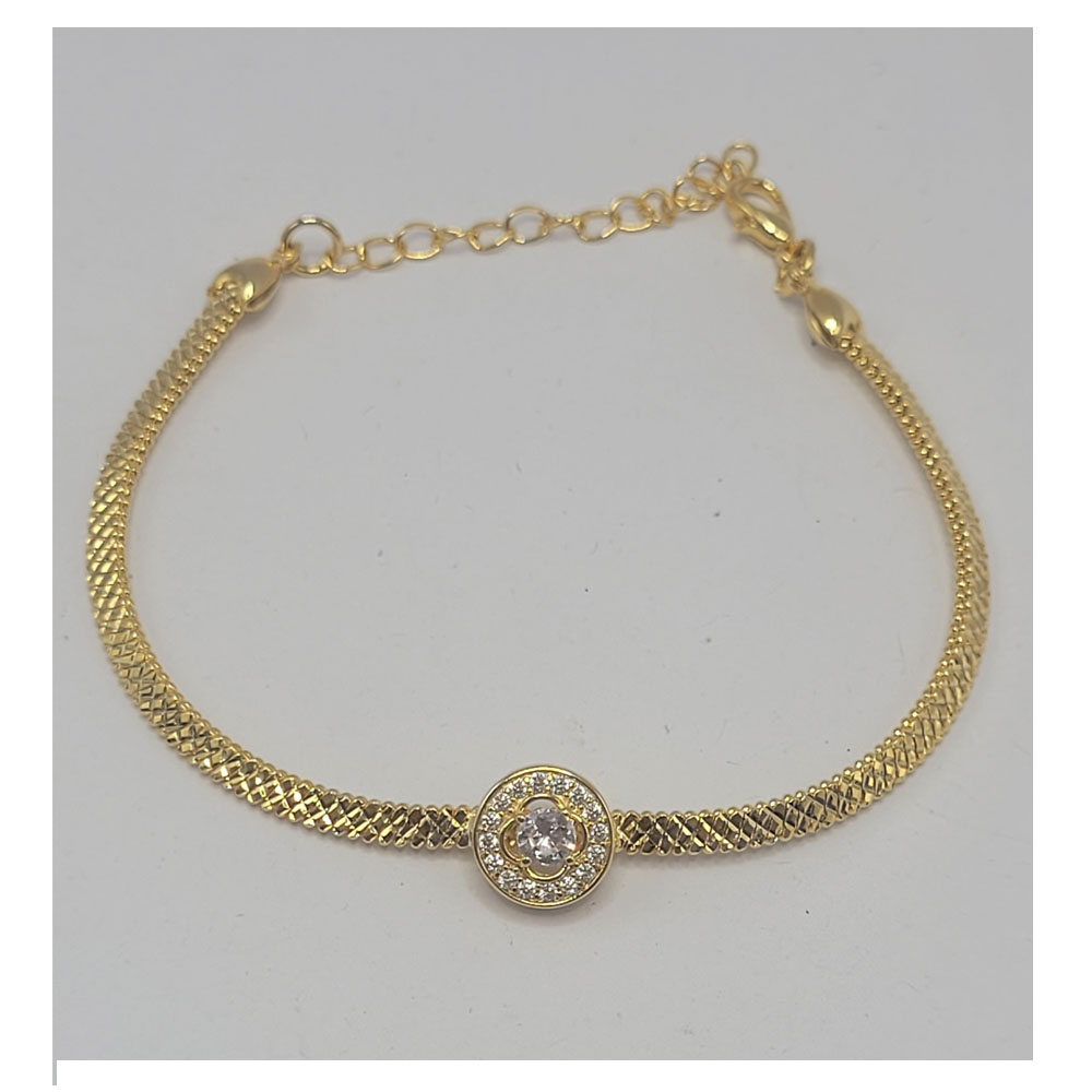 Pulseira dourada com design fino e sofisticado, destacando um cristal central emoldurado por pequenos brilhantes.
